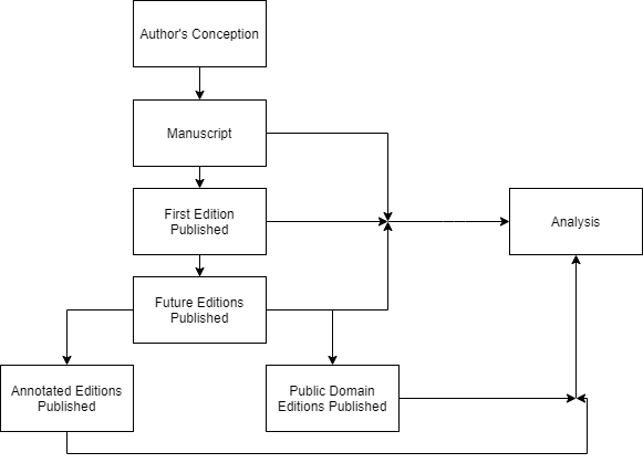 At the top of the diagram is data in its rawest possible form: entirely contained within the mind of the author (in this case, Sterne). From there, the author writes these thoughts down, creating a manuscript. This is the rawest data accessible to others (at least if it is made publicly available), and it is processed to the extent of the author’s cognitive filter, which seems to be rather minimal in the case of Sterne. Next, the author publishes the manuscript into a first edition, which is generally the first text available to read. Given the large editing and revision process generally necessary to turn a manuscript into a published book, the data is considerably more processed, but still reminiscent of the urtext. If the work is successful, as Tristram Shandy was, further editions are published which potentially fix any typographical mistakes, include author prefaces or illustrations, and reflect on the work’s success. While these versions are more processed than first editions, they do not differ too drastically. Next, after the text has entered the public domain and established itself as an important historical work, critical editions are published which contain explanatory notes and selections of seminal essays, like the Norton Critical Edition or the Oxford World’s Classics Edition, and online public domain versions are made available through resources like Google Books and Project Gutenberg (although, if my narrative above carries any weight, these versions should only be referenced lightly). The former of these generally are the most processed versions of the text accessible, because of the wealth of information added to the original data, while the latter are frequently reproductions of the early editions of the text, and hence are arguably less processed than earlier efforts. Finally, throughout all these processes of processing, theorists and critics busily analyze the text, using various theoretical frameworks to look for meaning, or using various meanings to justify theoretical frameworks. Analysts may compare how the text has changed throughout the years, or they may be ambivalent as to which version to which they refer. Only at this stage does the data transform into its most processed form, as not only has the text been elaborated upon, but, moreover, only the elements necessary for analysis are included. In effect, the analyst takes a text, determines which parts are most important, and casts asides the rest (not necessarily because the rest is unimportant, but because only a limited amount of the text can be discussed in a reasonable amount of time (if we had all the time in the world, then this would likely not be an issue (but that is going down a rabbit hole way beyond the scope of this blogpost))).