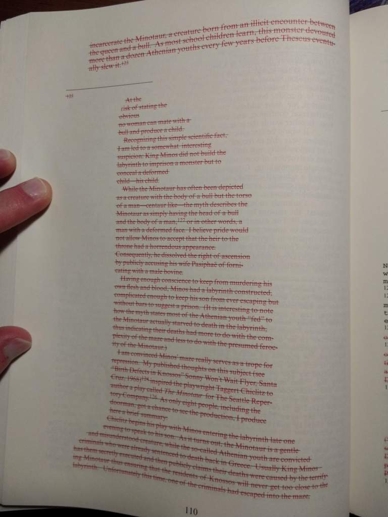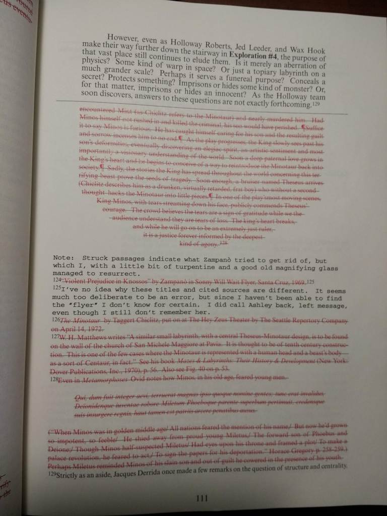 The most obvious typographical element of this passage is its use of red-colored and struck-through font, which already demonstrates a notion of attempting to hide one’s creation. A note by Truant mentions that the “[s]truck passages indicate what Zampanò tried to get rid of, but which [Truant], with a little bit of turpentine and a good old magnifying glass managed to resurrect” (Danielewski 111). This quote relates Zampanò to the labyrinth owner Milos, in that both attempt to obscure their creations (the passage itself in the case of the former, and the Minotaur in the case of the latter) within a maze, while Truant, acting like labyrinth-maker Daedalus, allows the passage to live on, albeit within the realm of a maze-like structure. Moreover, his usage of the word “resurrect” seems significant, as it demonstrates Truant’s godlike role as the editor of the work. He has the ultimate say on how the text gets represented, even if it contradicts Zampanò’s apparent intentions, so that he, like Ovid’s depiction of Daedalus, “to unimagined arts / … set[s] his mind and alter[s] nature’s laws” (Ovid VIII.189-190).